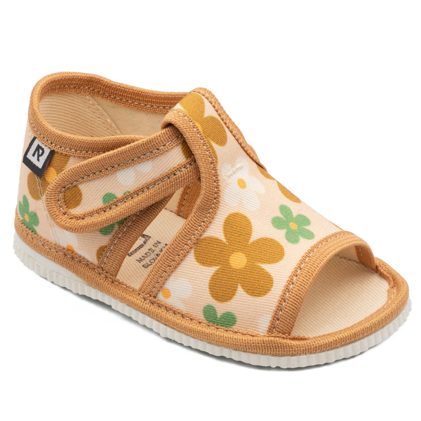 Detské papuče, sandálkového strihu s otvorenou špicou so zapínaním na "suchý zips ". Tvar špičky s dôrazom na typicky detský dominantný palček zabezpečuje dostatočný priestor pre prsty. Papučky sú ľahké, pružné, vyrobené z textilu ( zo 100% bavlny ), ktorý zabezpečuje priedušnosť a dokonalú prispôsobilosť tvaru nohy. Stielka papučky je v časti klenku vyplnená penovým materiálom, čo zabezpečuje dieťaťu pohodlnú chôdzu a podporuje zdravý vývoj nohy. Papučky sú určené do interiéru ako prezúvková obuv. Je zdravotne a hygienicky nezávadná. Obuv sa ako nová môže na hladkých povrchoch šmýkať ( keramická dlažba, laminátová podlaha…) Na takéto povrchy je vhodnejšia obuv z našej ponuky pod označením inovatívne a flexi papuče. V rámci licenčného oprávnenia na používanie ochrannej známky Žirafa a Česká kvalita bola posudzovaná komisiou odborníkov a detského ortopéda. Pri kúpe tejto obuvi si môžete byť istý, že ste pre pohodlie, bezpečnosť a zdravý vývoj nôžky Vášho dieťatka urobili správny krok.