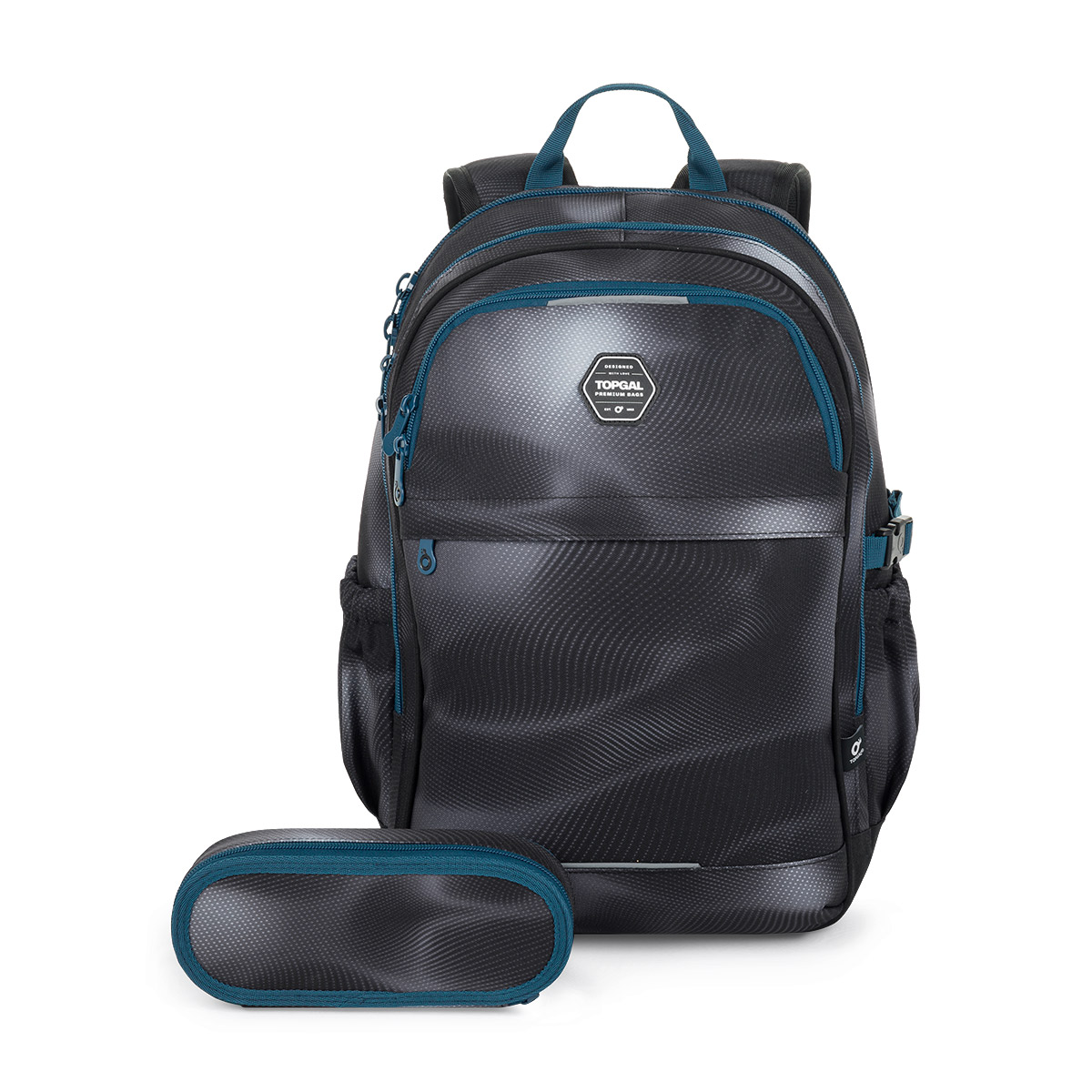 Set tašky s peračníkom pre študenta. Súčasťou setu sú tieto produkty: RUBI 25034 – Študentský batoh Modré žíhanie, ETUE 25034 – Študentský peračník