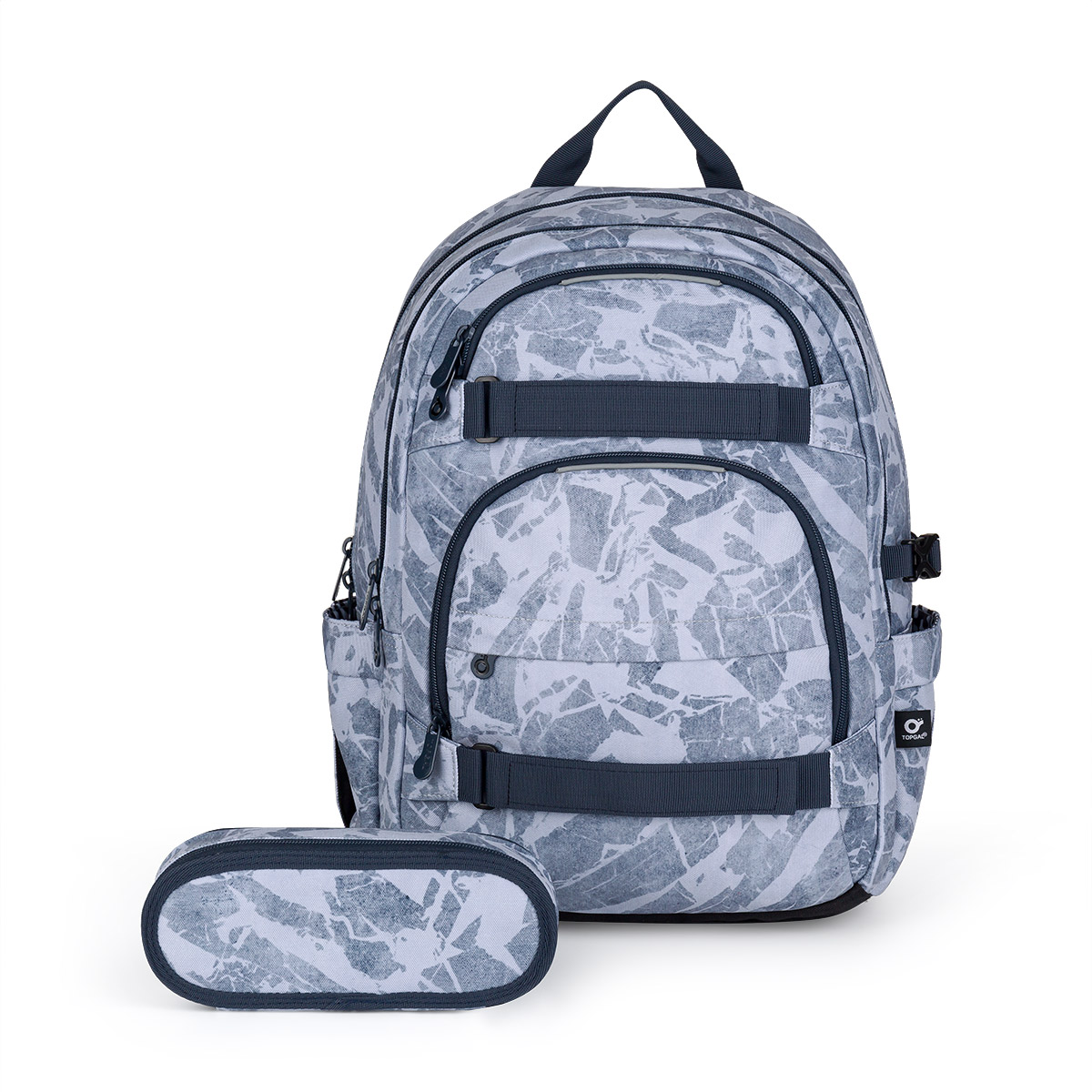 Set tašky s peračníkom pre študenta. Súčasťou setu sú tieto produkty: VIKI 24036 – Študentský batoh Šedý mramor, ETUE 24036 – Študentský peračník